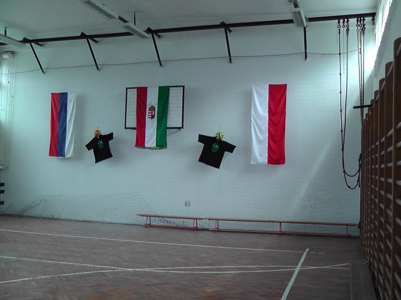 Egy újabb jó ötlet Kabán: A résztvevő csapatok zászlói között a torna emblémázott pólói röplabda-fejekkel.