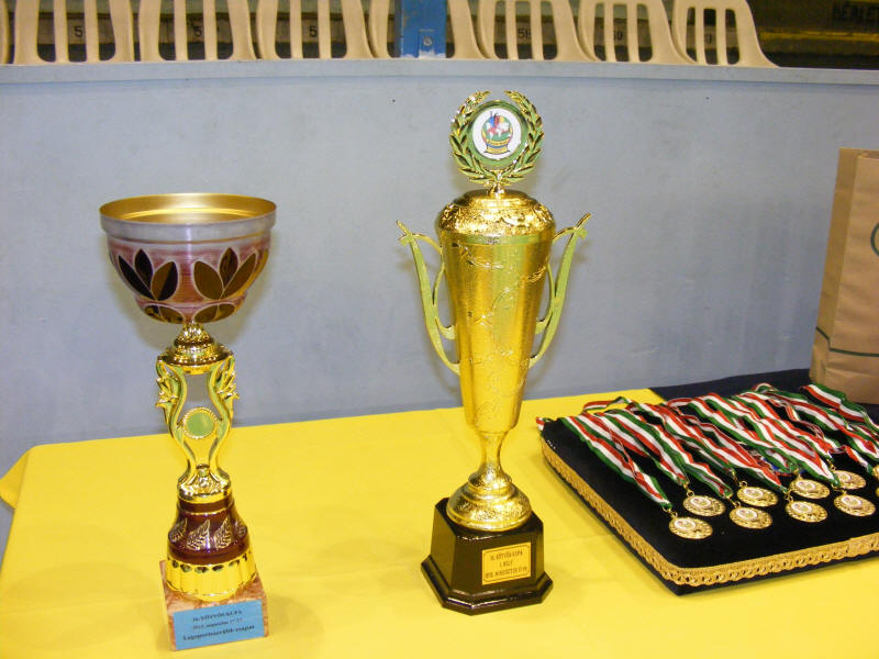 A legsportszerűbb csapat és az első helyezett serlege, illetve utóbbi érmei.